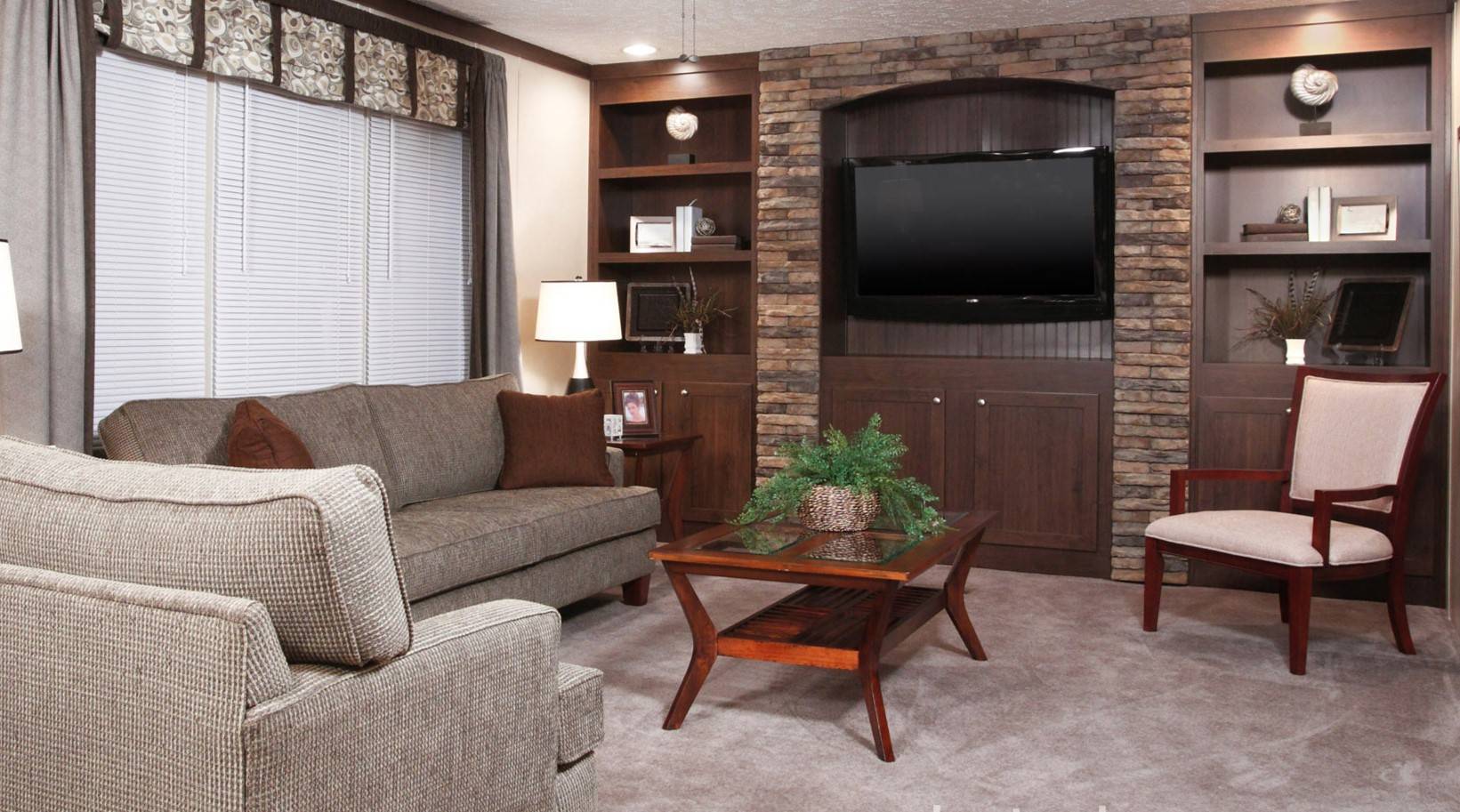 Однотонный ковер идеально гармонирует с коричневой мебелью