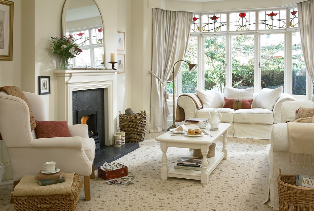 Светлый ковер с небольшим принтом для классической гостиной