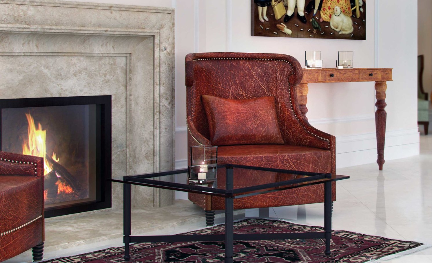 Небольшой классический ковер можно расположить в зоне отдыха возле кресел и камина