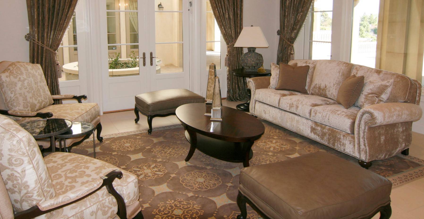 Ковер в бежевых тонах с орнаментом гармонирует с классической гостиной