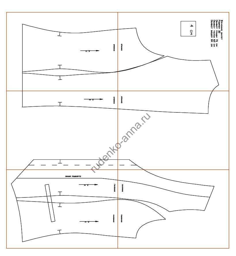 Для размера 48, с ОГ = 96 см, ОТ = 76 см и ОБ = 104 см, выкройка показана ниже.