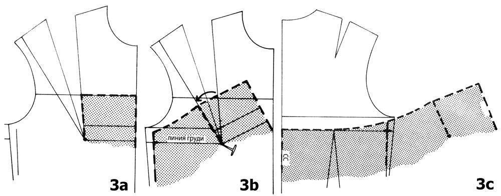 На илл. 3 предложен альтернативный способ построения верхней линии переда комбинации. Скопируйте часть переда ниже линии ширины груди от средней линии переда до правой стороны верхней вытачки (илл. 3а). Затем, вращая скопированный участок относительно точки центра груди (см. илл. 3b), совместите стороны верхней вытачки и начертите участок верхней линии переда комбинации до верхней точки на боковой линии переда, затем скопируйте боковую линию переда. Поставьте контрольный знак в точке пересечения боковой линии и линии груди. Совместите скопированный участок верхней части переда комбинации со спинкой по боковым линиям, совмещая контрольные знаки в области линии груди, и откорректируйте верхнюю линию комбинации от средней линии переда до средней линии спинки, как показано на илл. 3с.