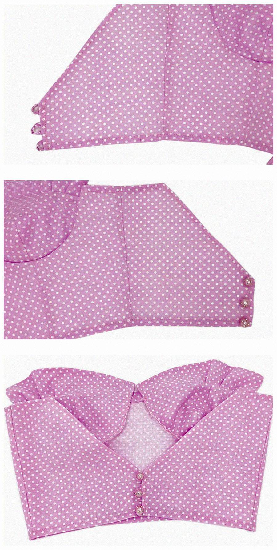 Теперь делаем застёжку. Нам понадобятся три пуговицы и узкий шнурок из той же ткани, что и корсаж.