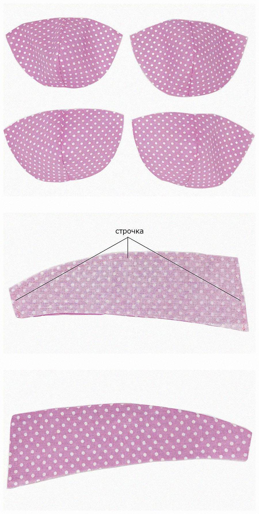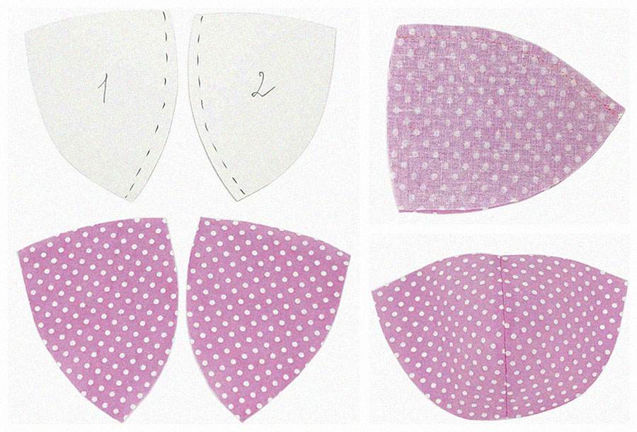 Таким же образом сшейте и разутюжьте остальные три пары деталей. Возьмите пару деталей №3 (верхняя часть чашек), сложите их лицевыми сторонами внутрь и сострочите прямой строчкой с трёх сторон: двум коротким и одной выпуклой. Выверните сшитую деталь на лицевую сторону и проутюжьте. Аналогично обработайте вторую пару деталей №3.
