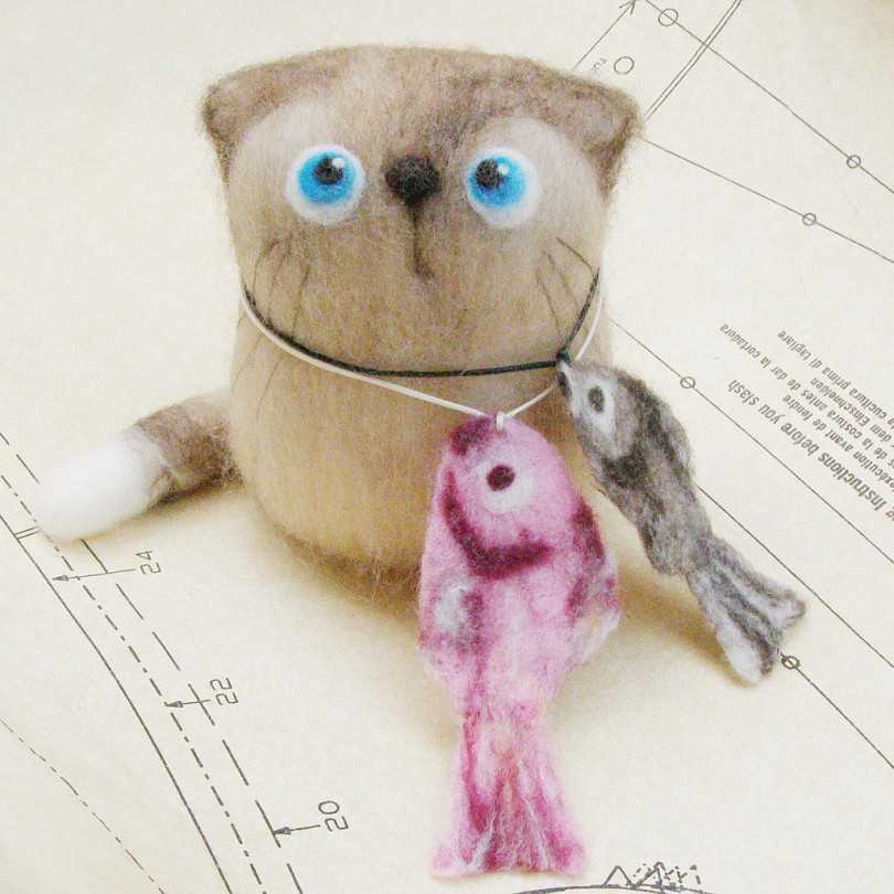 - Кот-рыболов. Самый простой вариант. Понадобится две выкройки: тело с лапками и ушками и рыбка. Хвост и мордочку оформляют нитками мулине. Для удочки подойдёт спица или палочка для роллов, леска из нитки.