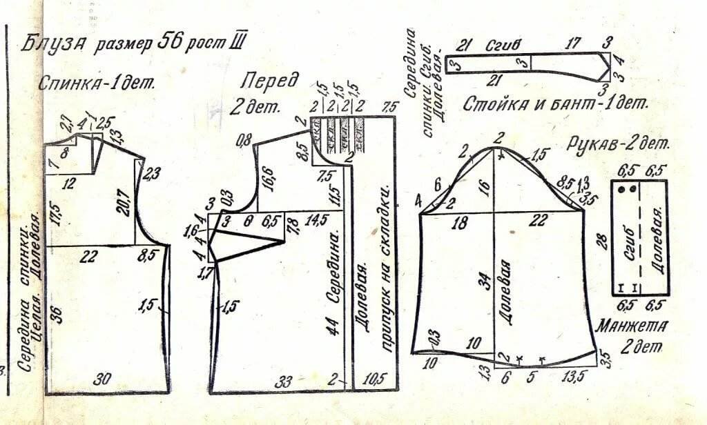 Дополнительно к выкройке блузке необходимо построить Выкройку воротника на стойке и манжету рукава-фонарика.