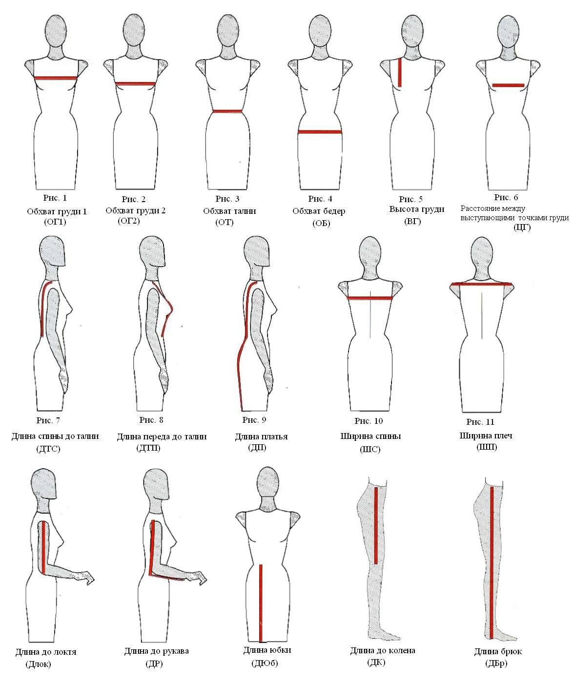 - полуобхваты — шеи по основанию, груди и бедер по наиболее отстоящим от торса точкам, талии на самом узком уровне.