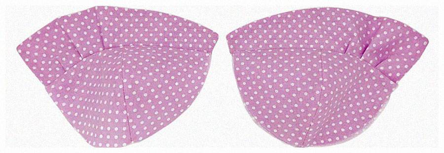 Таким же образом сшейте и разутюжьте остальные три пары деталей. Возьмите пару деталей №3 (верхняя часть чашек), сложите их лицевыми сторонами внутрь и сострочите прямой строчкой с трёх сторон: двум коротким и одной выпуклой. Выверните сшитую деталь на лицевую сторону и проутюжьте. Аналогично обработайте вторую пару деталей №3.