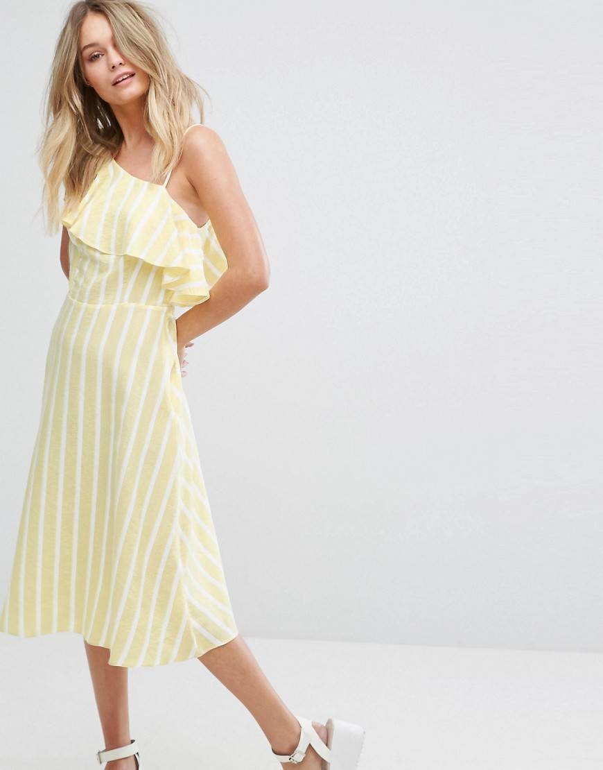 Платье-рубашка остается на пике популярности уже несколько лет. За основу кроя взята обычная мужская рубашка, обычно она имеет пуговицы по всей длине и ремешок. Модель с одним открытым плечом выглядит очень легко и воздушно, потому идеально подходит для летнего сезона.