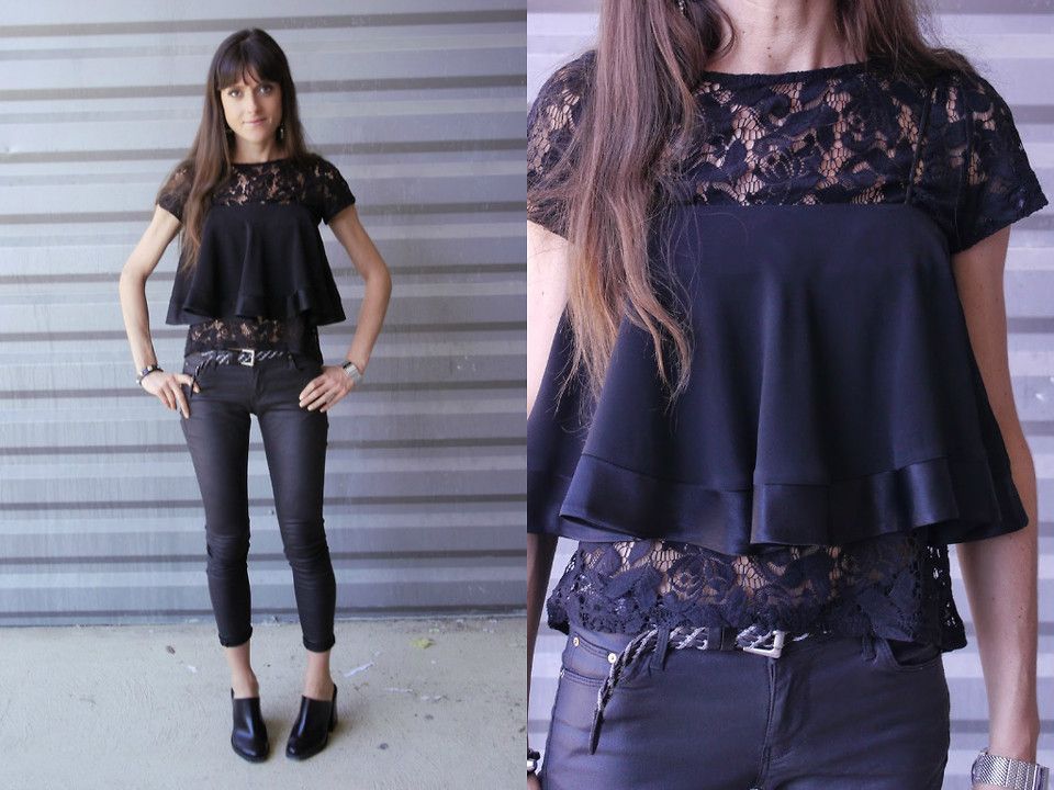 Кружевная блузка с оборками в сочетании с черными брюками и туфлями-лодочки станет основой для коктейльного образа. Его завершит красная помада и клатч.