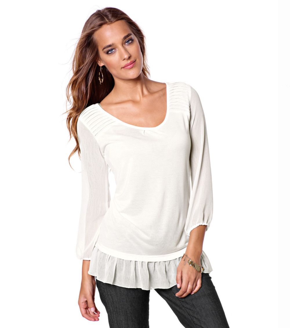 Если волан пришит к низу блузки – носите ее навыпуск. К примеру, белая блузка подойдет к узким джинсам или брюкам.