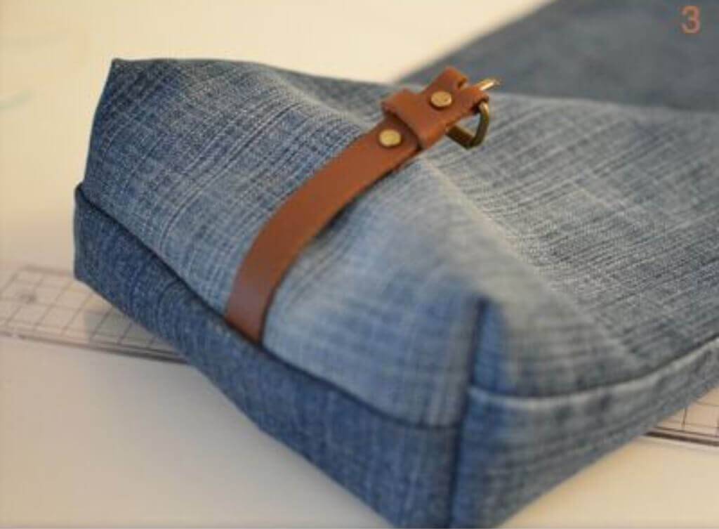 Проделываем отверстие с внешней стороны изделия и продеваем шнурок с помощью английской булавки. Теперь вы знаете, как сшить сумку из джинсов (старых или порвавшихся)!