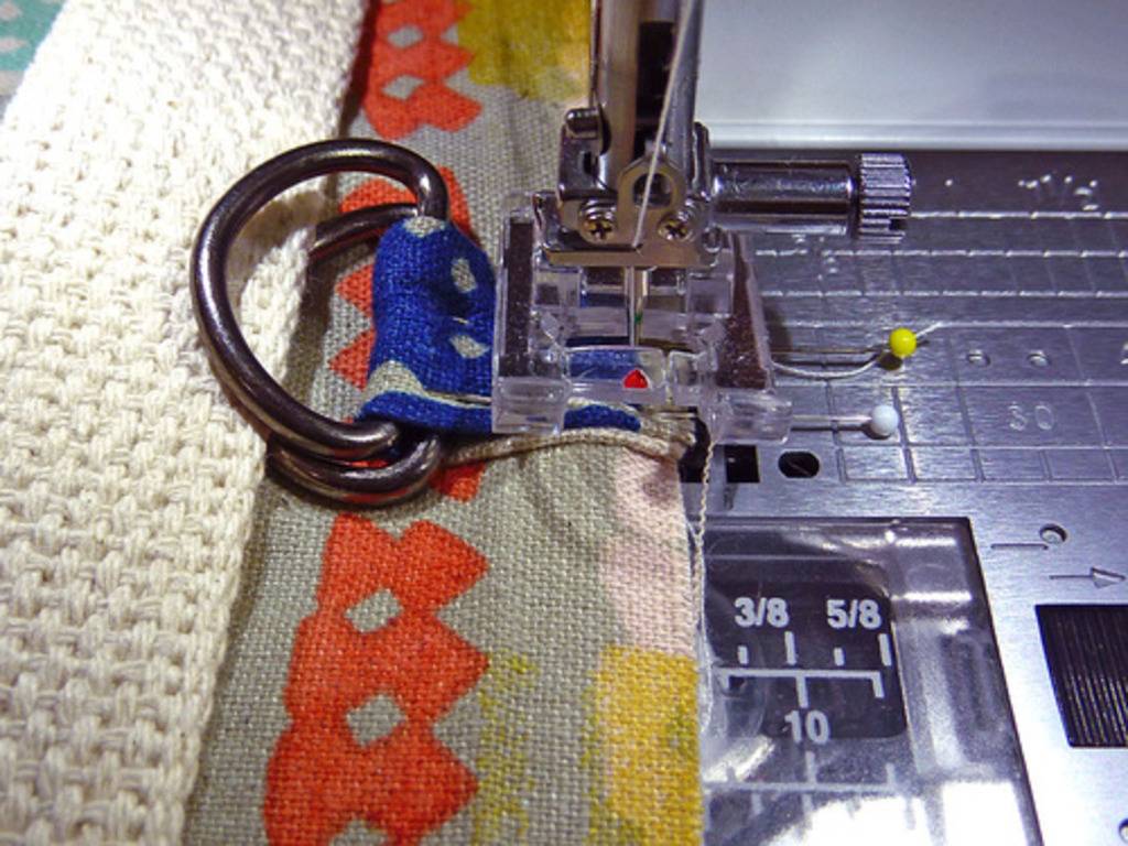 Петли с кольцами, как и хлопчатобумажные ремни, нужно пришить к облицовочной полосе, которую потом нужно подогнуть, закрыв ею края сумки. После подгиба полосы нужно подогнуть петли с кольцами и сами ручки таким образом, чтобы они оказались над сумкой. Разумеется, положение петель и ручек нужно зафиксировать портновскими булавками, а потом пристрочить сами элементы на машинке.