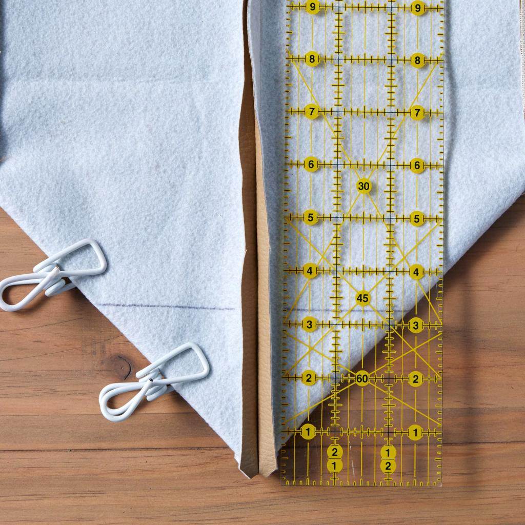 - Чтобы сделать изделие объемным, нужно нижние уголки, которые будут формировать дно, сшить по косой. Для этого следует отделить равные треугольники с каждой стороны. Фигуры нужно сделать одинаковыми.