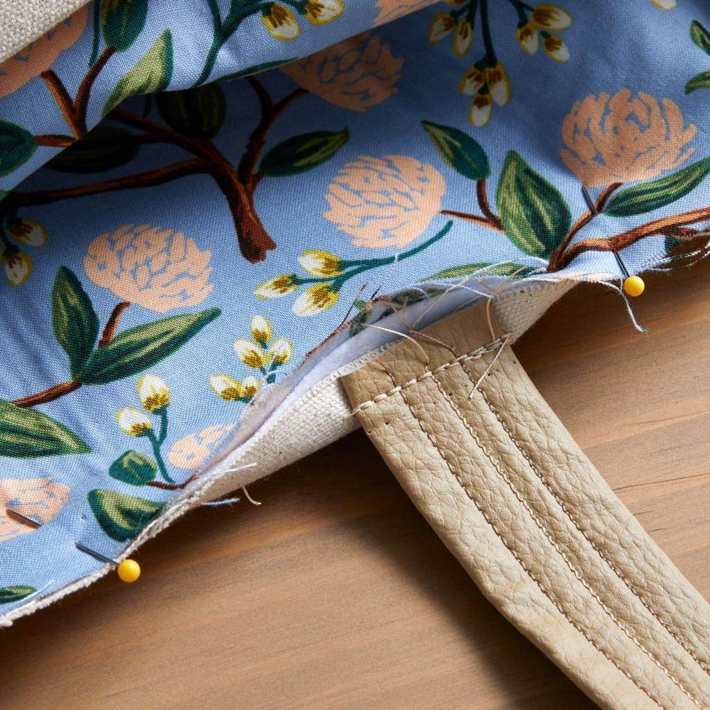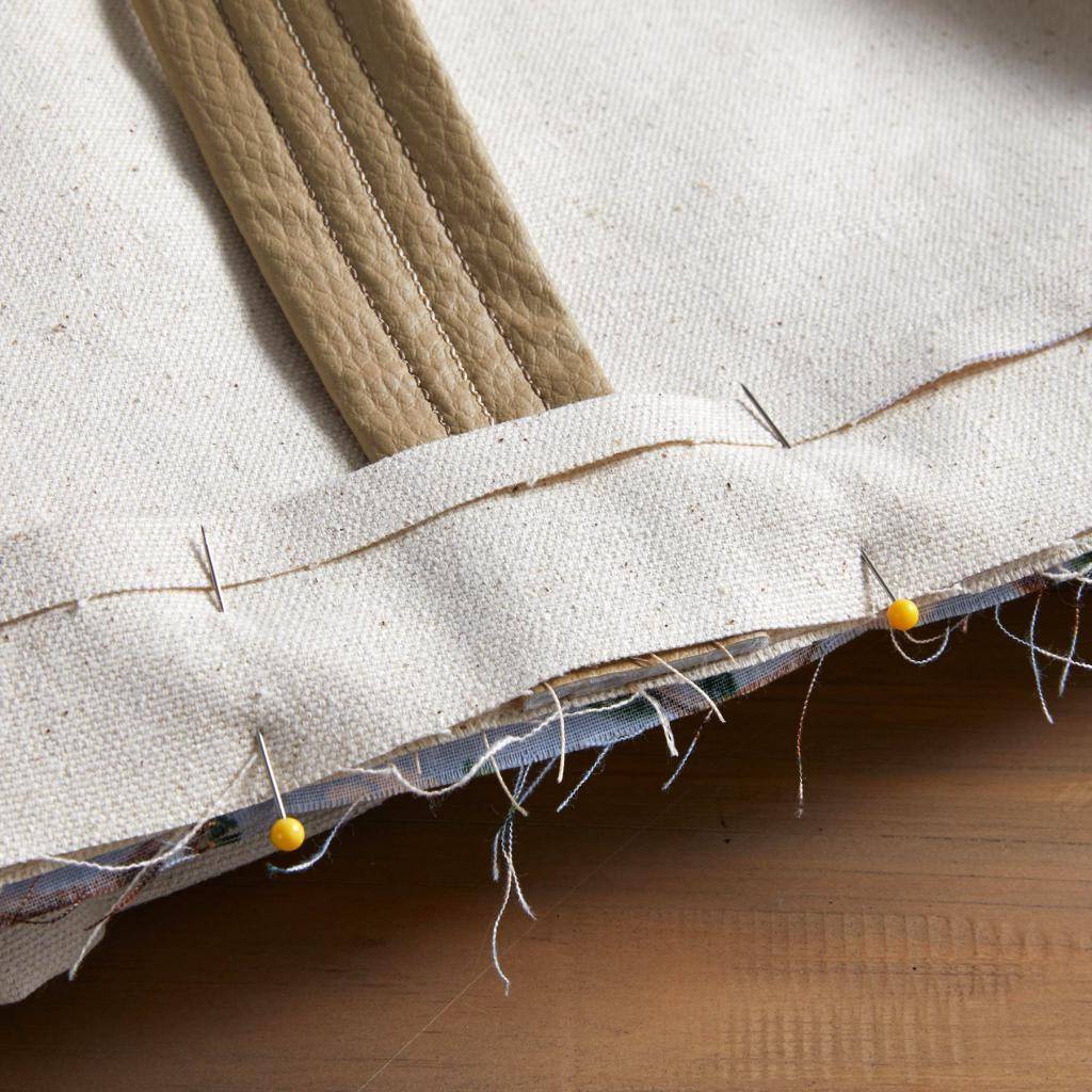 Вложите подкладку в основную часть сумки, соединив изнаночные стороны деталей. Убедитесь, что ручки находятся снаружи изделия. Выровняйте боковые швы и углы двух частей, сколите заготовки булавками по верхнему, открытому краю. Стачайте изделие на машинке.