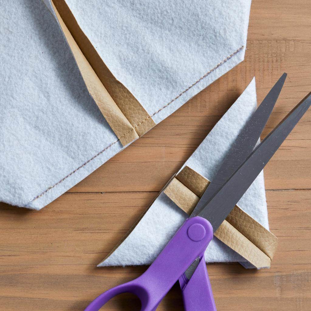 - Основу складывают лицом внутрь, совмещают низ и прошивают на машинке. Шов разутюживают, складывают углами по бокам и создают объем: прокладывают строчку от одной боковины до другой под углом 45 градусов перпендикулярно разутюженному шву. Лишнюю ткань обрезают. То же самое делают с подкладкой. Затем ее соединяют с основой (по верхнему краю), совмещая швы с помощью швейных булавок, и прошивают срез на машинке.