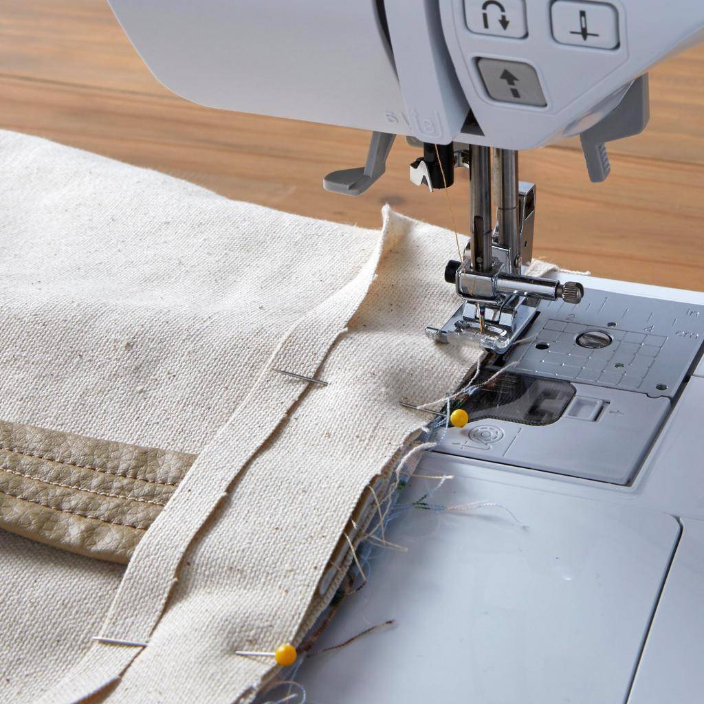 - Остается вывернуть изделие, обработать верх, загнув припуск внутрь, и пришить ручки. Чтобы облегчить проблему отстрочки, можно ориентироваться на метки, расположенные на металлической пластине справа от прижимной лапки, совмещая по ним текстиль.