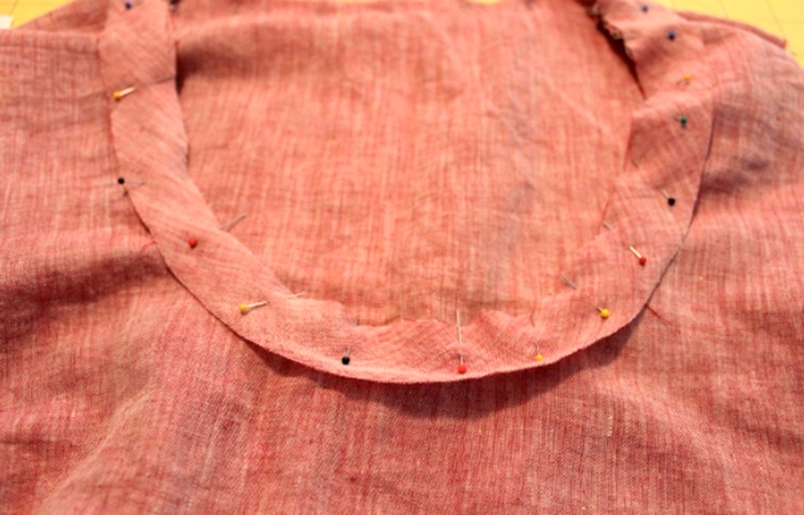 Это будет способствовать поддержанию формы во время эксплуатации, а также предотвращению деформации и растяжения ткани. Далее следует прикрепить булавками одну полоску по горловине, две по проймам лицом к лицу и после этого стачать на машинке.