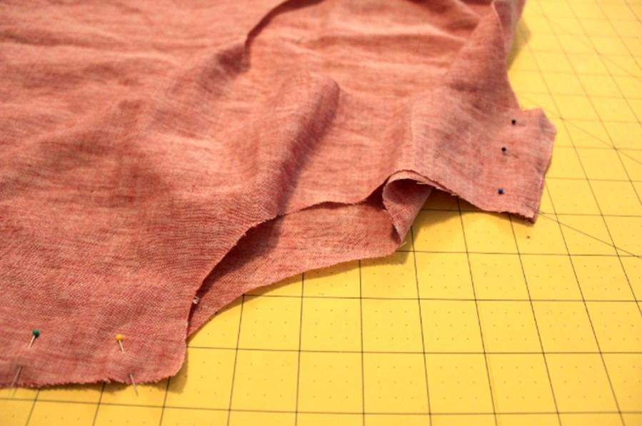 - Зафиксировать булавками, параллельно к срезу, одинаково распределяя размеры участков. Сметать если это нужно;