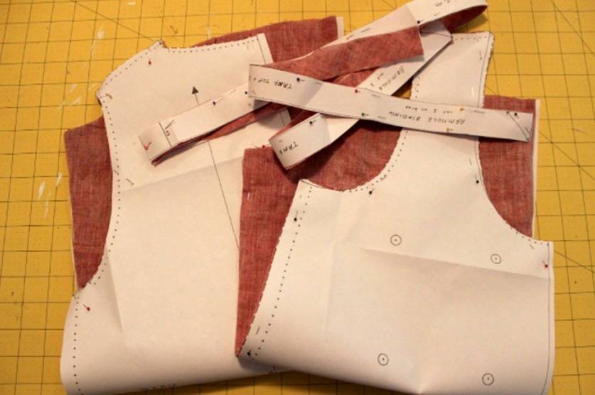 Для переноса выкройки на ткань бумажные образцы следует прикрепить английскими булавками к ткани, затем обвести портновским мелом или маркером и вырезать.