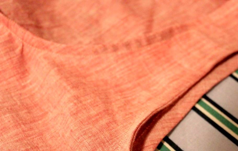 При обработке горловины и пройм изделий желательно соблюдать равное расстояние строчки от края.