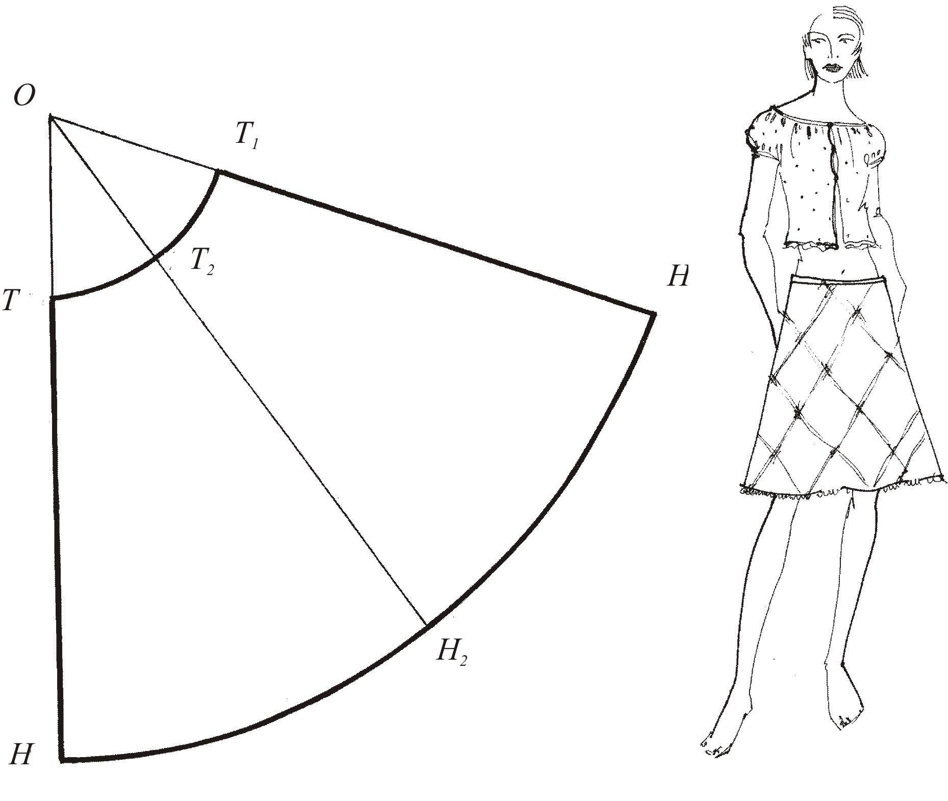 1) Нарисуйте на бумаге схему, как показано на 1 рисунке. Чтоб вычислить R, используйте формулу От/6–1, где От – обхват вашей талии. Чтоб нарисовать край юбки, к R прибавьте желаемую длину изделия.