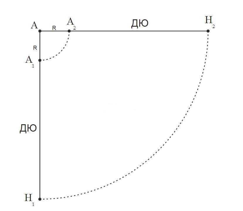 - От точек пересечения малого радиуса с линиями (А1 и А2) отложить длину юбки. Получившиеся точки обычно обозначают как Н1 и Н2.
