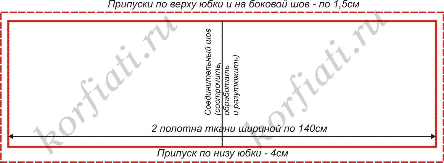 Полотно юбки в складку состоит из двух кусков, каждый шириной 140 см (без учета припусков на швы) и длиной по мерке (длина юбки определяется в зависимости от модели).