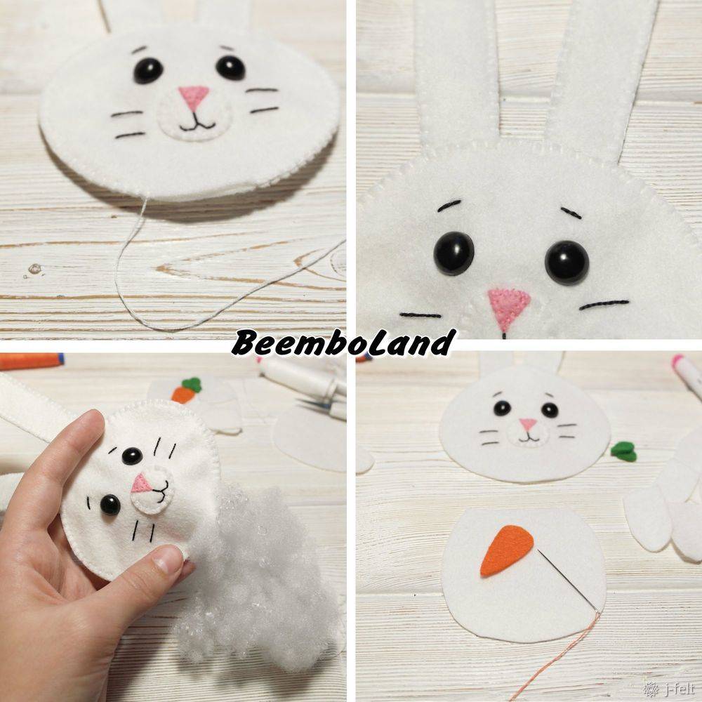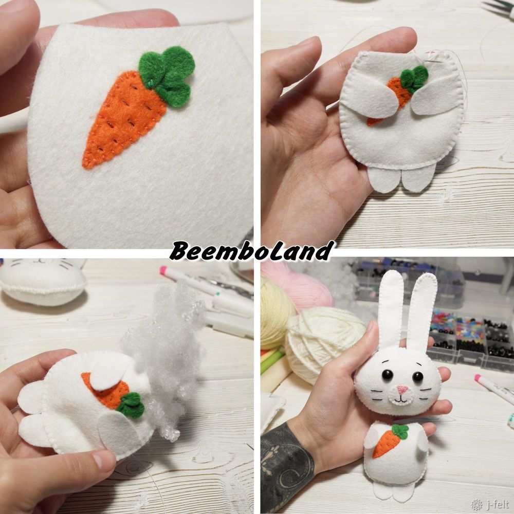 Убрать лишние нитки. Повяжите ленточку на шею кролику и украсьте его декоративными элементами.