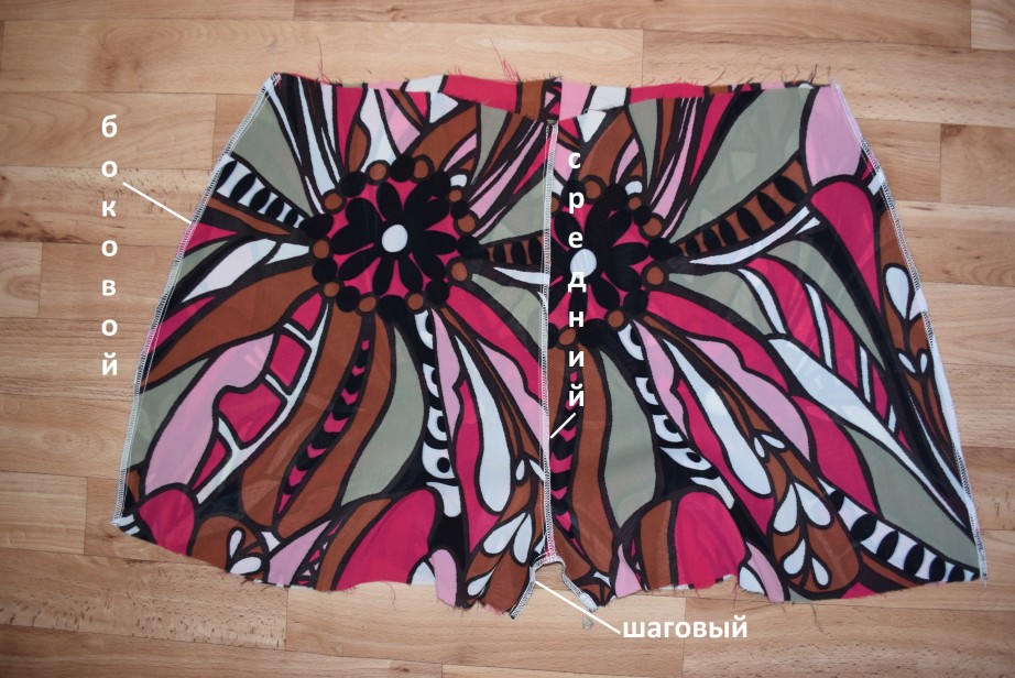 Передние и задние половинки шорт складываем лицевыми сторонами и стачиваем средние швы.