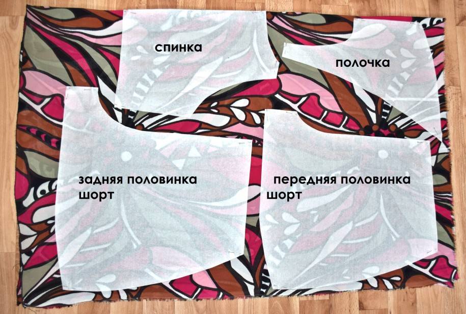 - Детали накладываются на сложенную вдвое ткань, закрепляются булавками, обводятся по контуру с учетом припусков на швы и вырезаются.