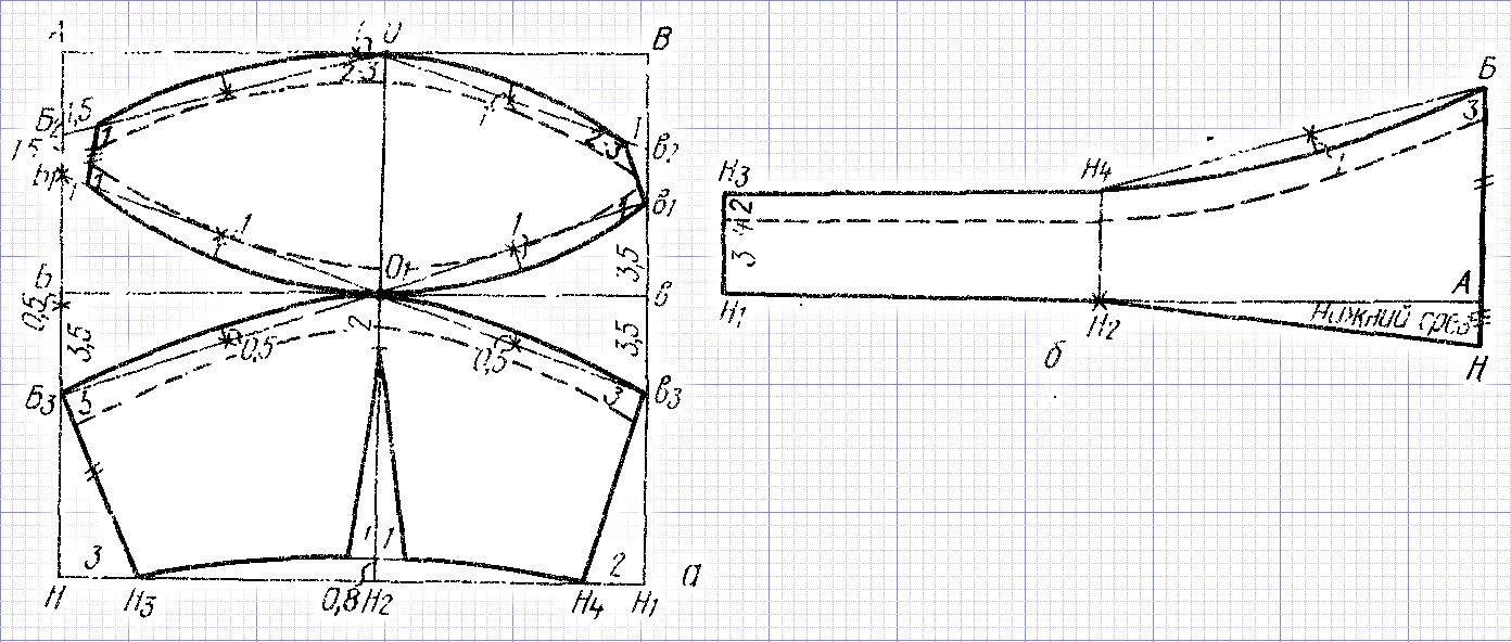 Такая же вытачка производится и со стороны спины на талии глубиной в 1 сантиметр. Низ же изготавливается по лекалу. При этом по середине переда от талии откладывается 10 сантиметров, по бокам — 8 сантиметра, по спине — 10 и 8 сантиметров.