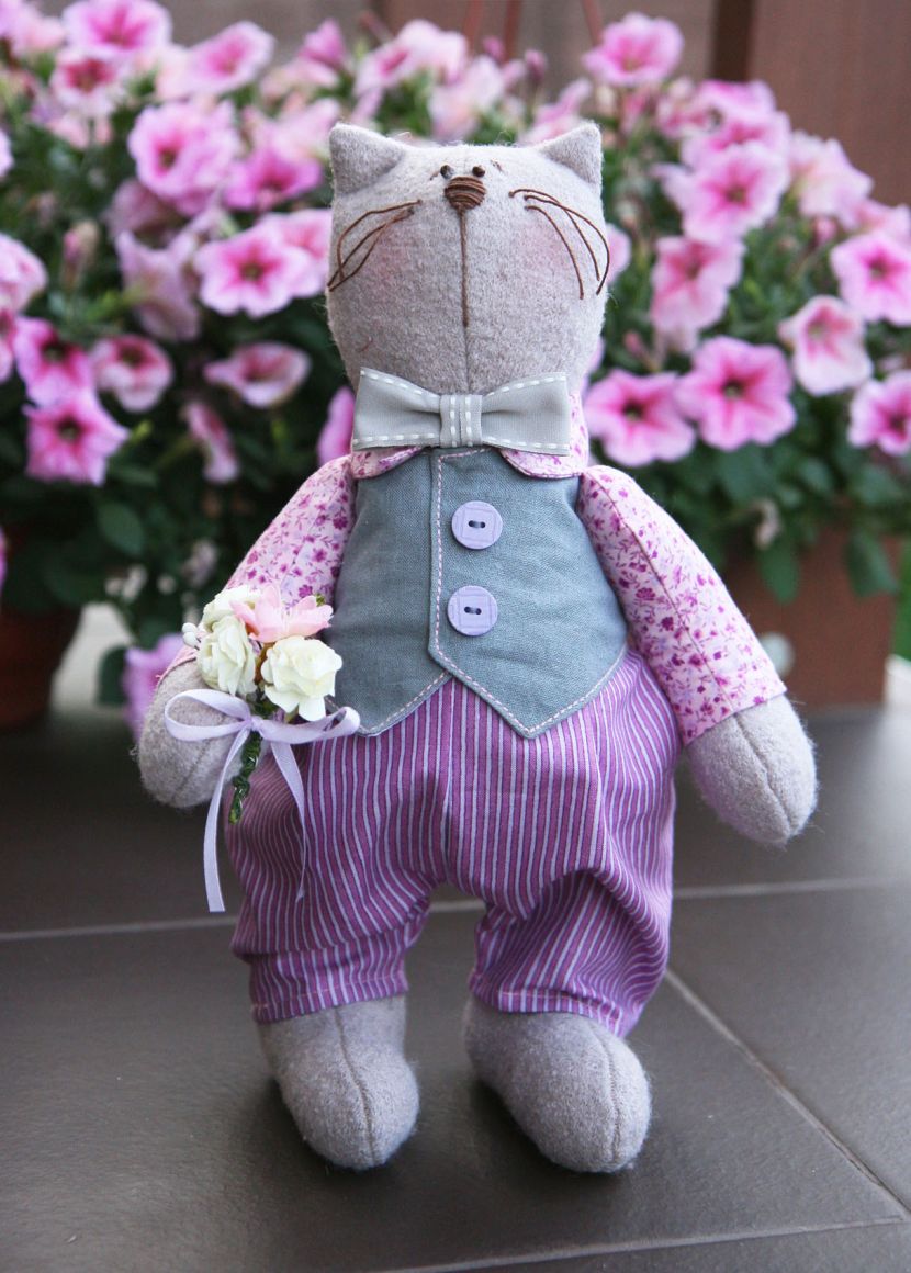 Остаётся сшить коту или кошке одежду, здесь всё зависит от вашего вкуса и фантазии. Кукольные вещи можно как сшить, так и связать из пряжи.