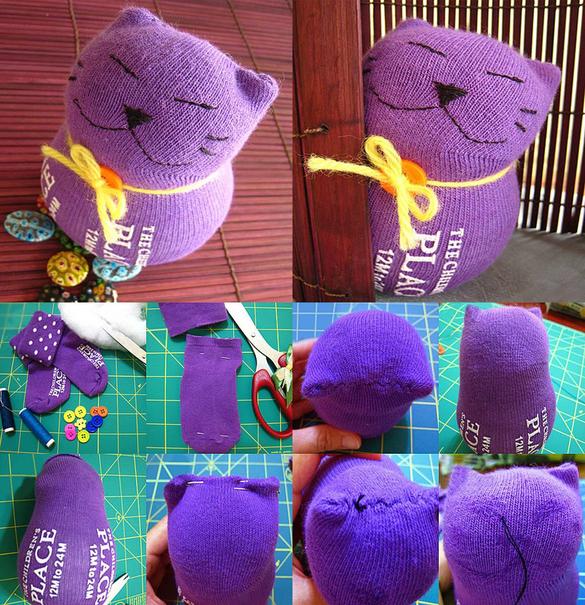 - Перед началом работы решите, какого котика вам бы хотелось сделать — худого или потолще. Исходя из этого, обрежьте носок в определенном месте. Если желаете получить упитанную игрушку – отрежьте часть носка, прикрывающую стопу, а верхнюю часть резинки отодвиньте в сторону.