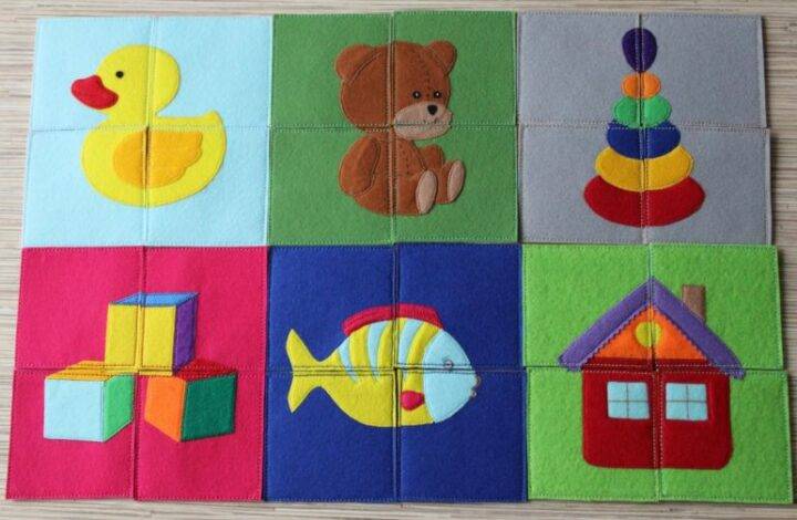 К примеру, можно изготовить из фетра пальчиковый театр, разноцветные пазлы, развивающие книжечки и др.