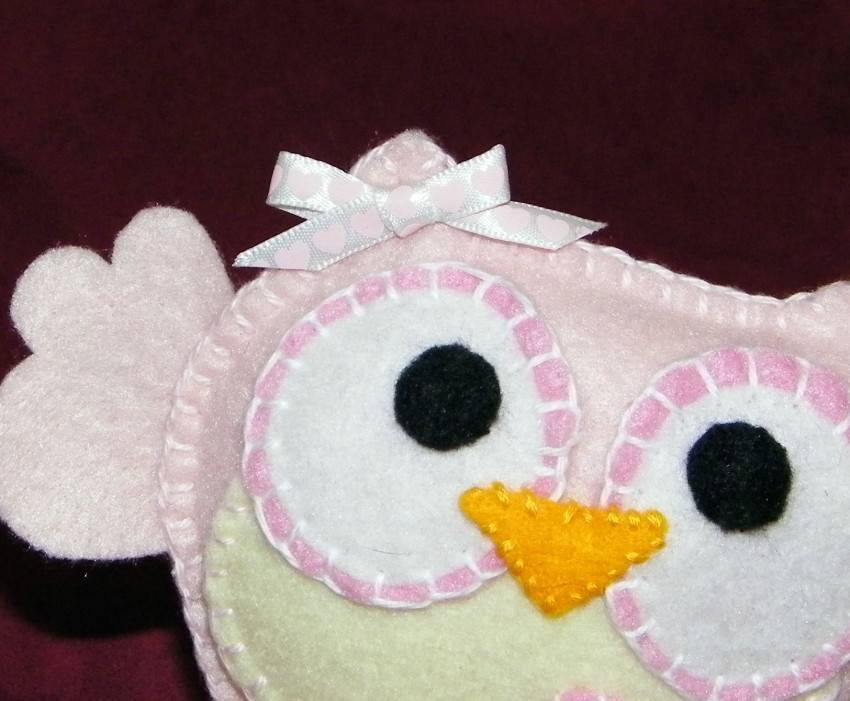 Совушку можно украсить декором – цветными цветочками с бусинкой по центру возле ушка и сбоку на фартучке.