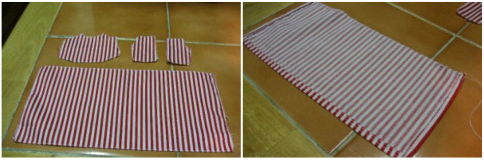 - Обработайте две детали спинки. Срез горловины прошейте двойной нитью.