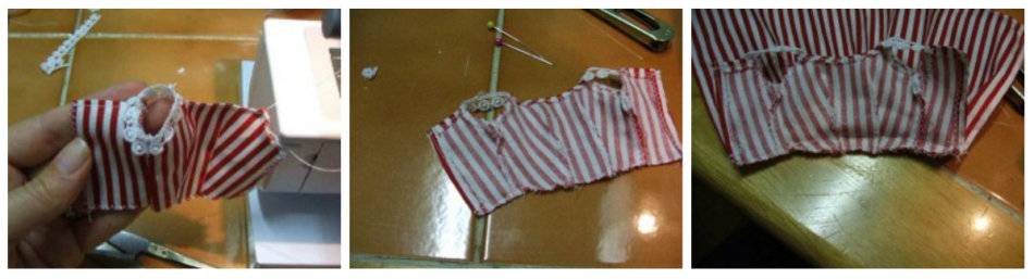 - Изготовьте бретельки: отрежьте кружево (де детали 2 на 8 см). Пришейте их вдоль проймы рукава полчки и соответствующей детали спинки. Если кружево вы не хотите, сделайте бретели из тесьмы или тонкой атласной ленточки.