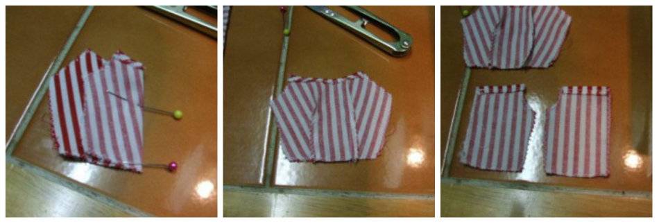 - Сложите ткань, как показано на рисунке, сколите ее булавками. Ширина полочки между выточками должна быть равной 3,5 см, снизу – 1 см. Сшейте выточки. Уберите булавки, обработайте выточки зигзагом.