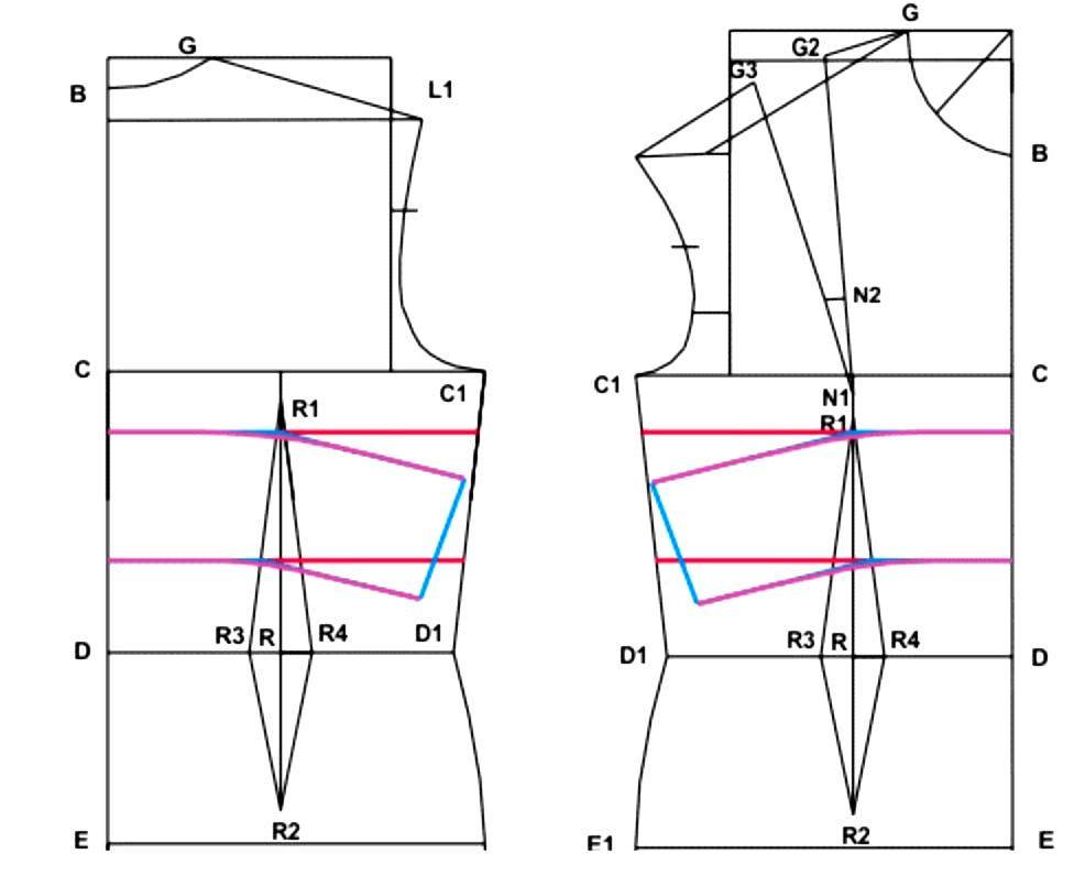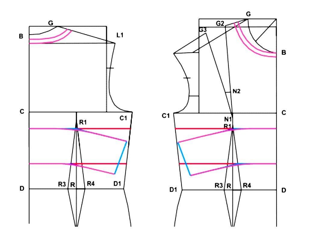 Начертить линии рельефов на переде и спинке, приталить по ним детали.