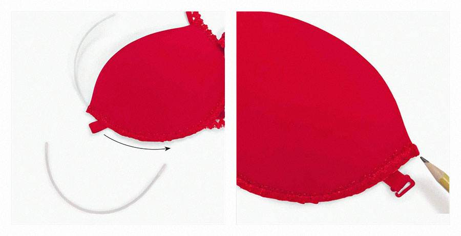 Проденьте металлические косточки в пристроченную к чашкам туннельную ленту, двигаясь от центра чашек к бокам. Запечатайте входы в туннельную ленту строчкой «мелкий зигзаг».