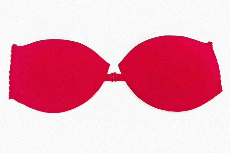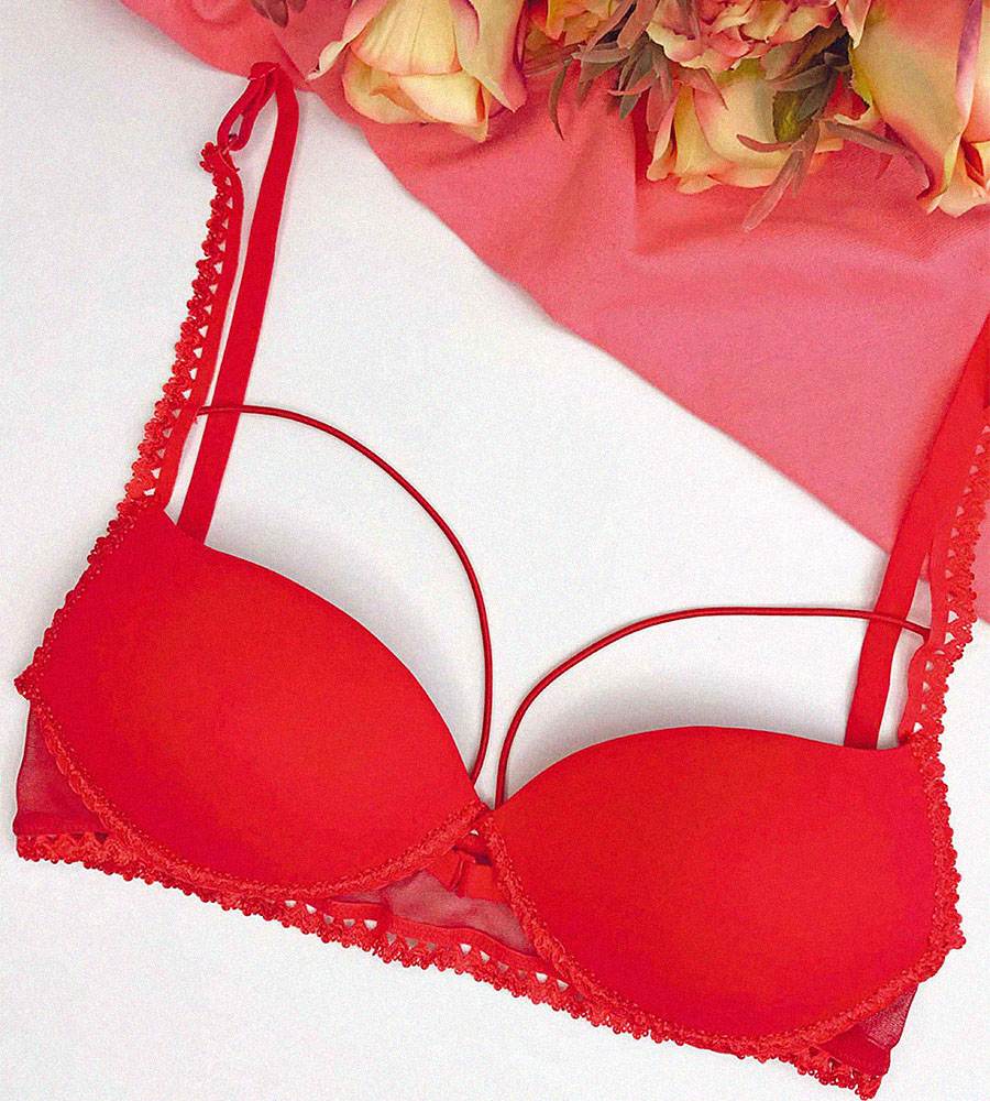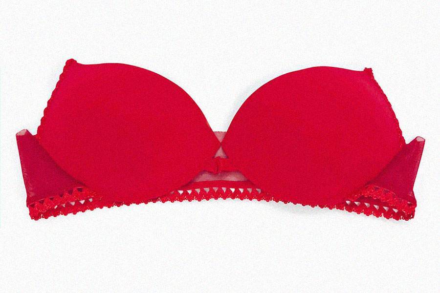 Для декорирования бюстгальтера разрежьте пополам эластичный шнурок и закрепите каждый отрезок у центра бюстгальтера (на уровне линии застёжки) и на бретельках, отступив 3-4 сантиметра от верха чашек.