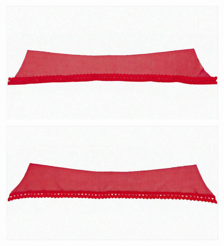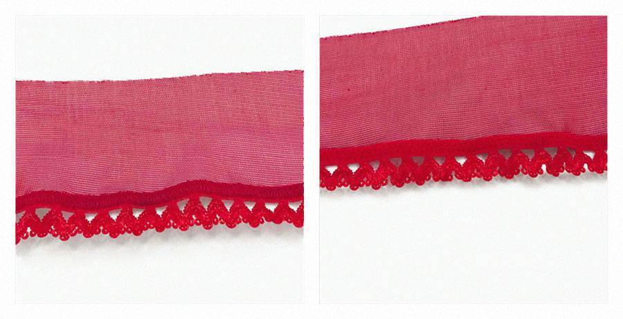 Отмерьте два отрезка кружевной ленты по 25 сантиметров для обработки нижней линии чашек. Пришейте прямой строчкой кружевную ленту к нижнему краю чашек с лицевой стороны.