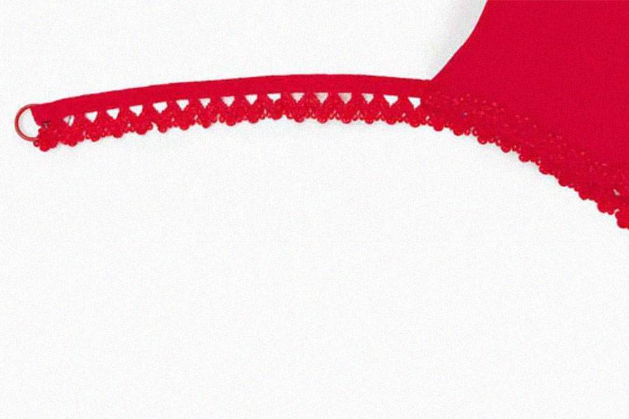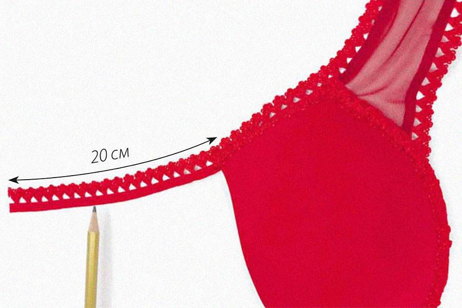 Отрежьте от кружевной ленты 65 сантиметров и приложите по верхнему краю пояса и боковым сторонам чашек с изнаночной стороны, оставив выше чашек по 20 сантиметров свободной ленты для бретелей.