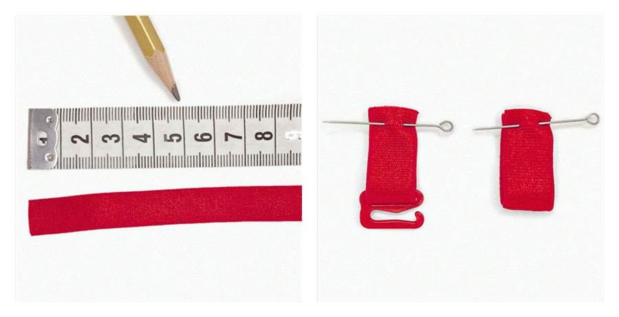Формируем застёжку бюстгальтера. Отрежьте от бретельной ленты два кусочка по 5 сантиметров. Один отрезок проденьте в крючок для застёжки. Обе детали сложите пополам и заколите портновскими булавками. У вас получается две петельки — с крючком и без.