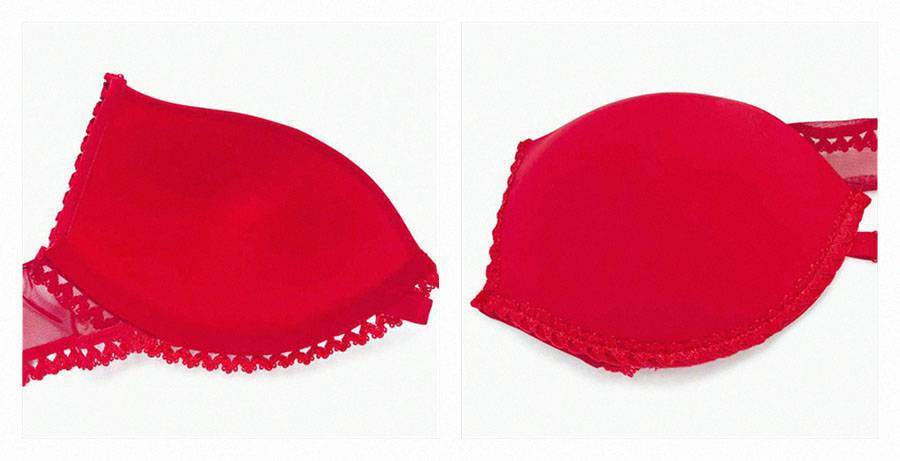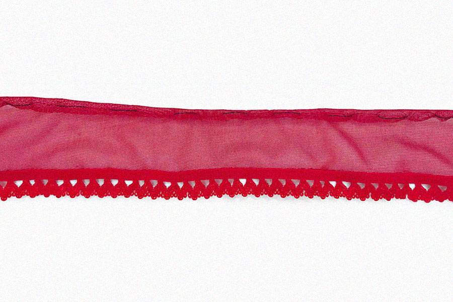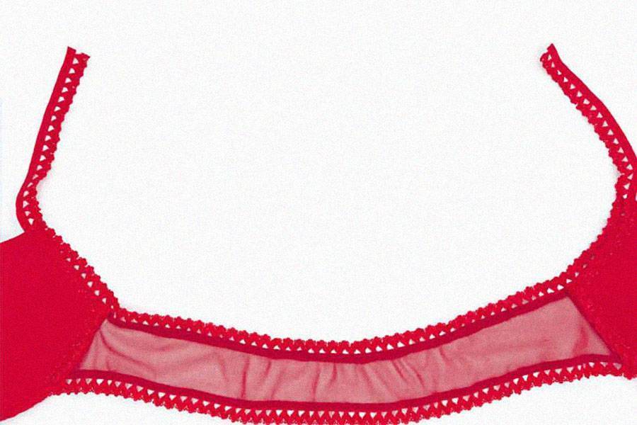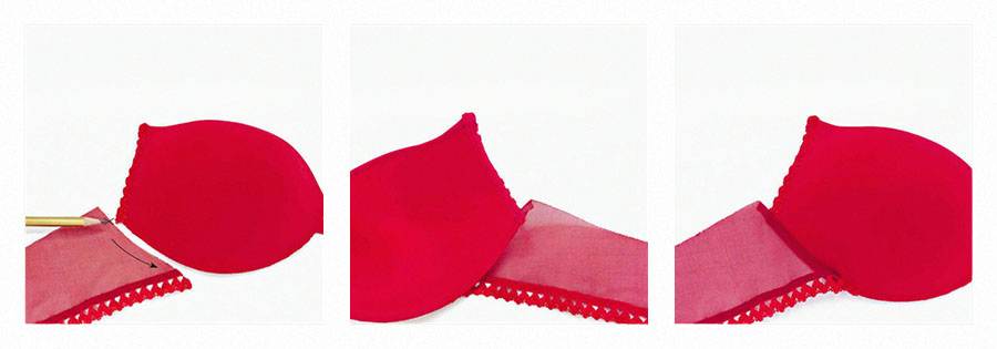 Обработайте боковую часть правой чашки кружевной лентой. Для этого заверните ленту по краю чашки так, чтобы её ажурная часть находилась на лицевой стороне чашки, и прострочите прямой строчкой, одновременно пришивая ленту и с лицевой стороны, и с изнаночной. Край ленты обрежьте.
