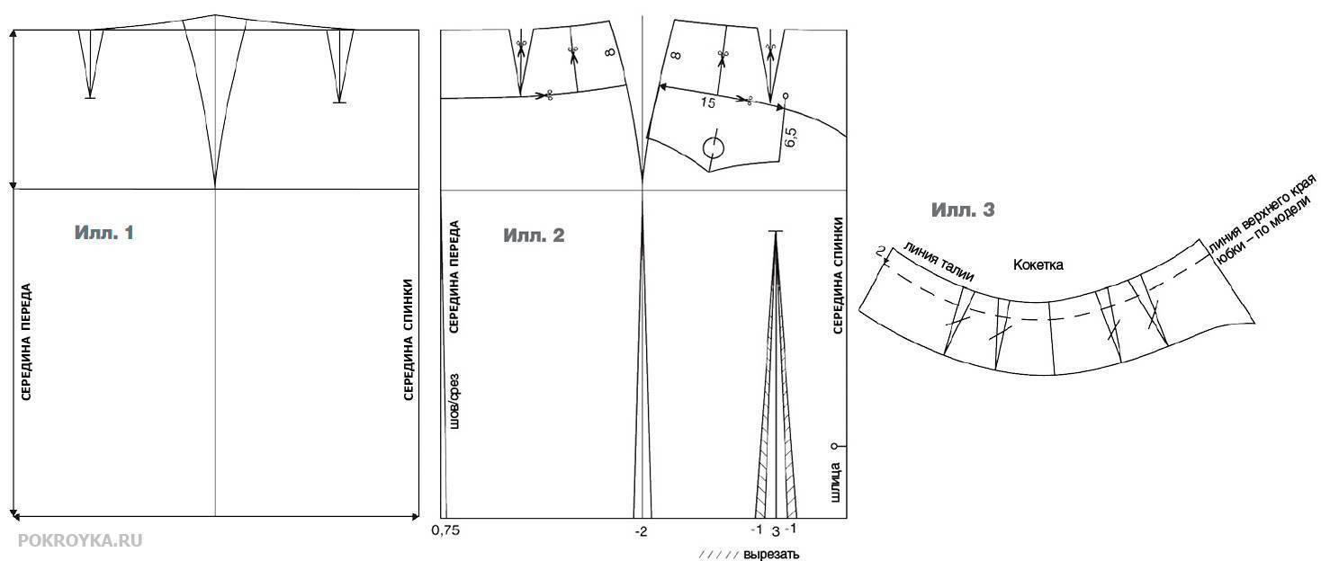 Отрезать кокетку и разрезать ее по намеченным линиям. Распределить растворы вытачек поровну у линий разрезов на кокетке. Закрыть вытачки. Совместить переднюю и заднюю части кокетки юбки в цельную деталь по боковым срезам (илл. 3).