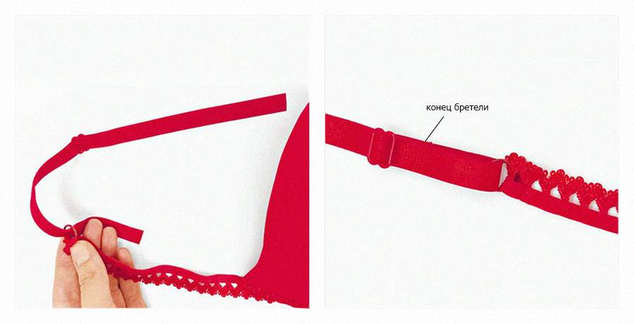 Конец бретельной ленты проденьте в кольцо, закреплённое на кружевной бретельке и снова в регулятор в обратном направлении. Закрепите строчкой «мелкий зигзаг» конец бретельки.