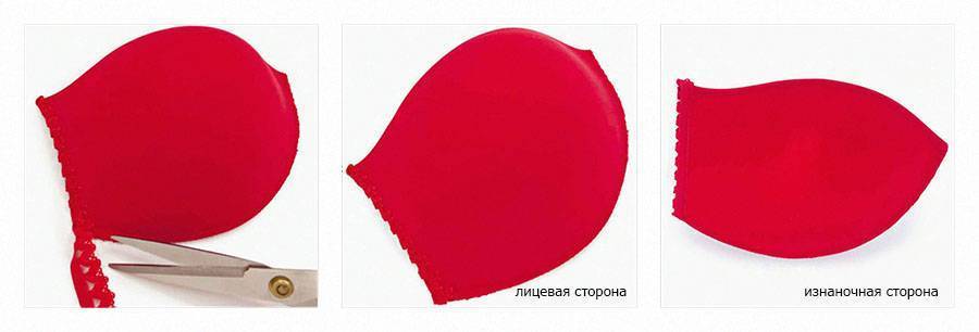 Начинаем с обработки чашек. Готовые чашки уже имеют трикотажное покрытие с лицевой стороны, поэтому покрывать их сверху дополнительной тканью нет необходимости.