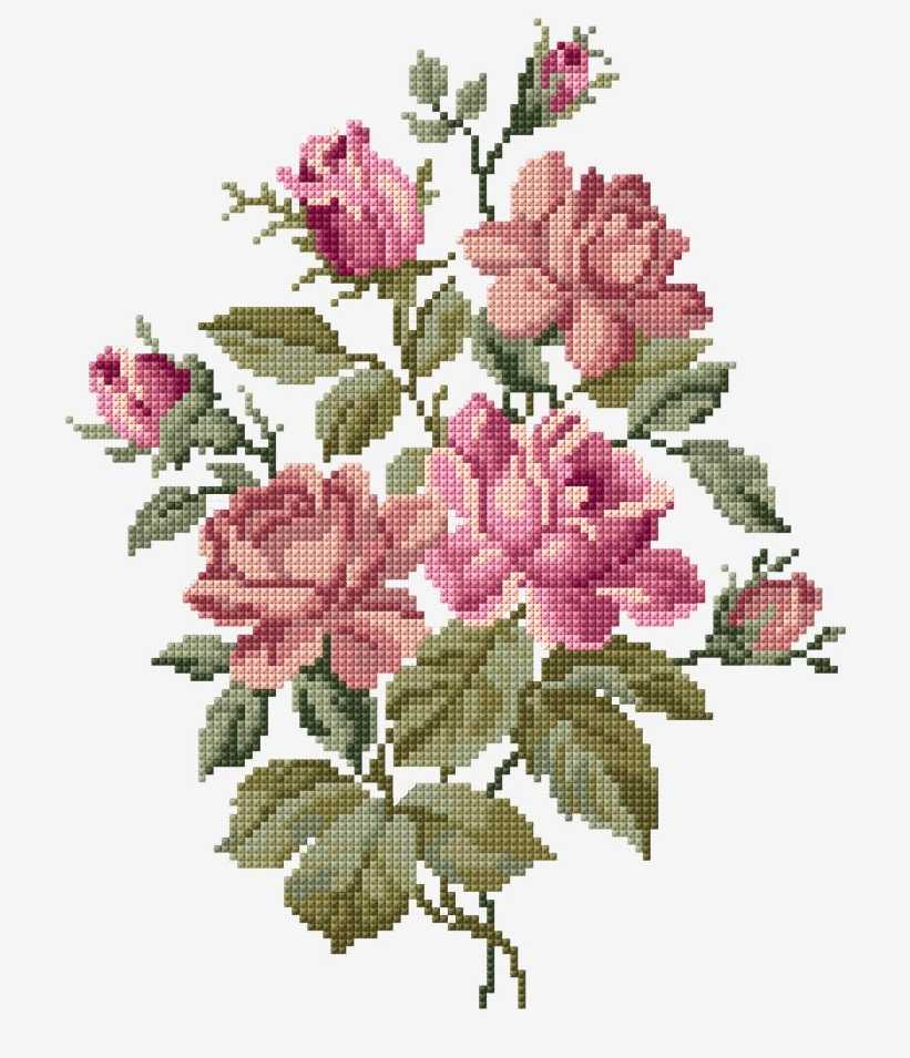 Вот такой нежный букет розовых роз, вышитый крестиком, украсит ваши домашние предметы. Размер готового мотива 23,6 х 20 см. Для вышивания рекомендуем взять 14-ти счетную канву Аида.